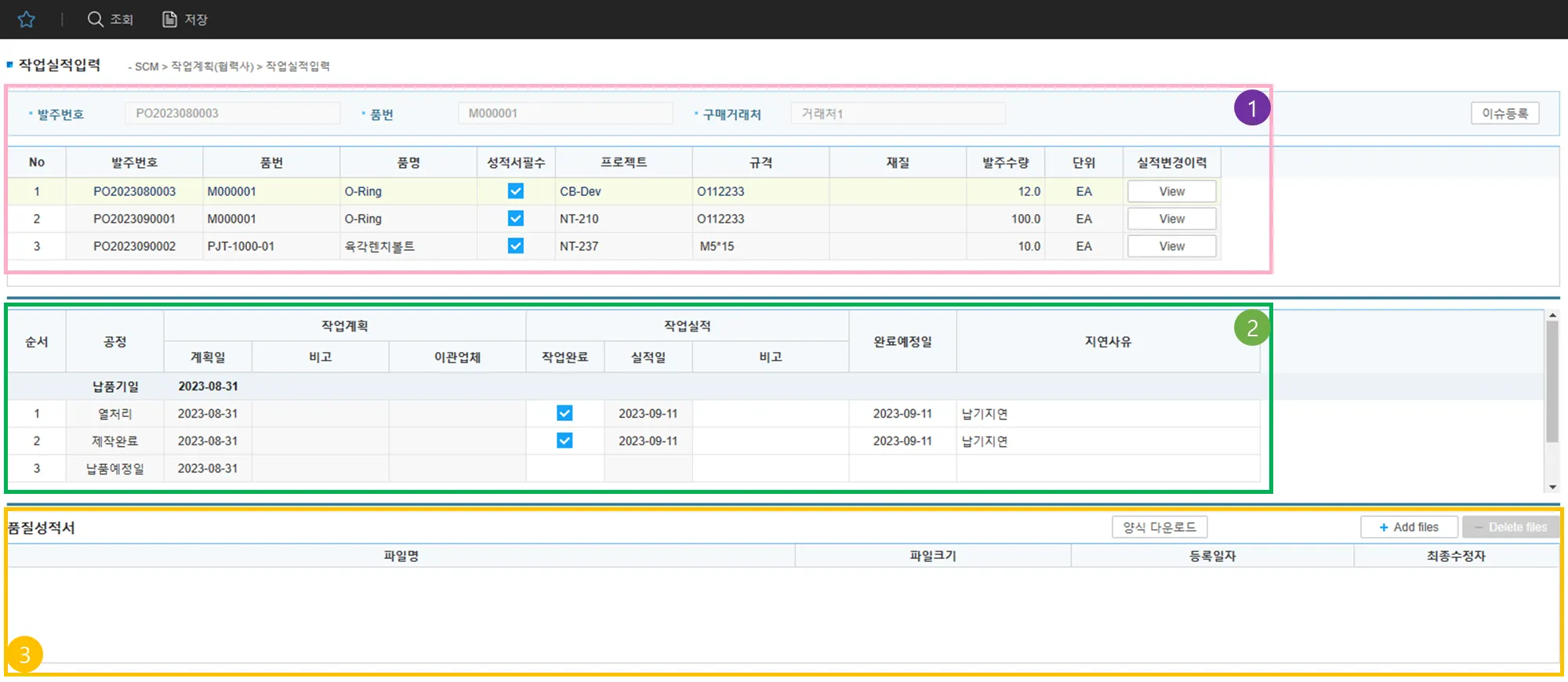 품질성적서 등록이 되지 않으면 마지막 “제작완료” 공정의 실적을 입력할 수 없습니다.
