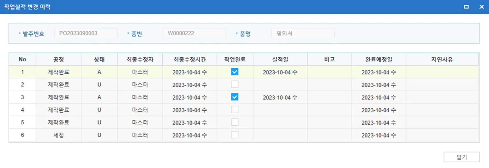 실적변경이력 : 공정별 실적의 이력을 조회할 수 있습니다.